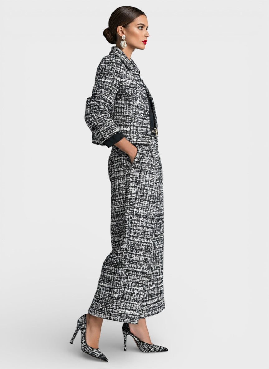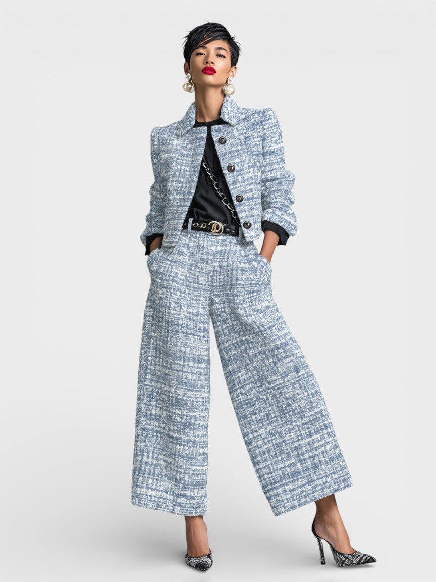 ✔︎ Povoljno i udobno krojenje – Struktuirana jakna i široke hlače koje izdužuju i omogućuju slobodu kretanja.